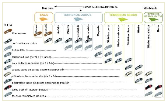 Por el contrario, las botas multitaco, al tener mayor número de tacos, mucho más cortos y de forma redondeada, ofrecen una superficie de descarga para el peso corporal muy alta, aumentando por tanto la estabilidad para las articulaciones de las pierna.El calzado adecuado para jugar en terrenos de HA de 3ª generación, (que tengan un correcto mantenimiento), se recomienda una bota con suela/taco tipo Traxion Artificial Grass (AG) (ovalados), que permiten el reparto de las cargas que sufre el cuerpo y una protección adicional para proteger el cuero de la abrasión.Si la longitud de la fibra (hierba) es menor, al estar más desgastado el terreno o con poco mantenimiento, se recomienda una bota con suela/taco tipo Multi Ground Grass (MG) (multitacos: suela de 22 tacos), que también tienen protección contra la abrasión.Para los de HA de 2ª generación (casi moqueta), los Taxion turf o similares, pero no está diseñado este calzado para jugar en HA y para terrenos más duros, las suelas de tipo Traxion Hard Ground (HG) o similares, pero éstos carecen de la parte protectora que sí poseen los modelos anteriores.Las marcas comerciales, comienzan a etiquetar su calzado con la etiqueta correspondiente cuando sea indicado para HA.Lo ideal, es usar dos tipos de botas según el tipo de superficie que se puede encontrar el jugador: AG o multitacos (MG) y, sobre el mismo terreno, elegir el adecuado.Antes sobre tierra, las botas duraban menos, por lo que había que comprar varios pares cada temporada. Las botas para HA duran más y con un par de botas (una de cada tipo) puede ser suficiente para toda la temporada.2.- Terrenos de hierba artificial antiguos, tipo moqueta.Estas botas no tienen tacos individuales, sino que están hechas con una superficierugosa imitando a las botas de trekking, y están indicadas sólo para terrenos de juego de hierba sintética del tipo más antiguo, más corto, tipo moqueta.3.- Terrenos de hierba natural.Para terrenos blandos, como el césped natural, se recomienda la suela con tacos de aluminio o suela con tacos intercambiables, que nos permitirá tener en una bota dos tipos de tacos, los SG ( suelo blando ) y los FG ( suelo duro ).Utiliza los tacos largos de aluminio o algún material similar y ligero, sólo para jugar en campos de hierba natural. Estas botas pueden tener 6/8 ó 10/12 tacos recambiables. Si el terreno de juego está húmedo o muy blando, es aconsejable usar la de 6/8; si se trata de un terreno duro, normalmente se utiliza la de 10/12.Los tacos de material plástico con forma anatómica, son recomendadas para campos blandos o muy blandos, aunque a diferencia de las de tacos de aluminio, tienen mayor estabilidad y además la planta del pie sufre menos impacto al no ser de aluminio.4.- Terrenos duros o de tierra.Para los terrenos duros, por ejemplo en los campos de fútbol de tierra o albero nos decantaremos por el tipo de bota con tacos de goma especiales para suelo duro.Cuanto más duro sea el terreno de juego más blanda debe de ser la superficie de la bota.Para los terrenos duros como el césped artificial o la tierra, son recomendables los tacos de goma y multitaco, procurando que la goma no esté desgastada. Lo importante no es la marca, sino que el pie esté cómodo y que no se tengan molestias que puedan producir posibles llagas. Lo recomendable es usar un par de botas por temporada, que sean buenas, y de un precio razonable.